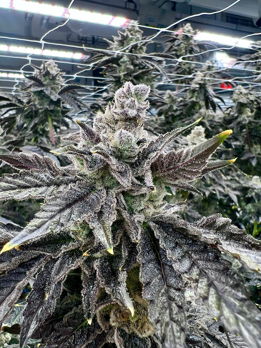 Moonbow is a beautiful plant with an insane bag appeal. Large apple shaped buds covered in extreme frost with purple, blue, silver and grey/ green hues.